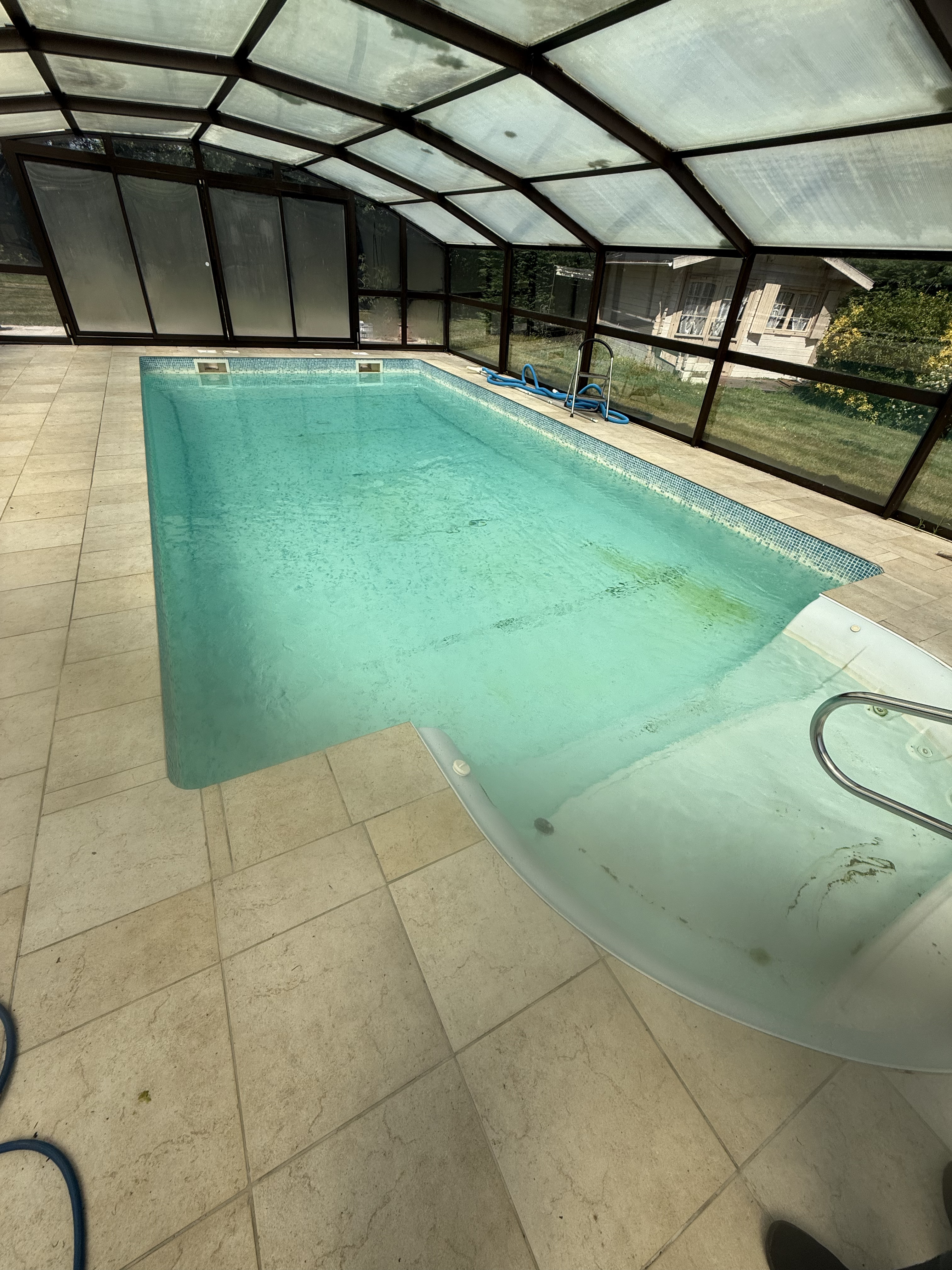 Brossez vigoureusement les parois, le fond et l'escalier pour décoller les algues fixées et les remettre en suspension pour que le chlore puisse les éliminer.